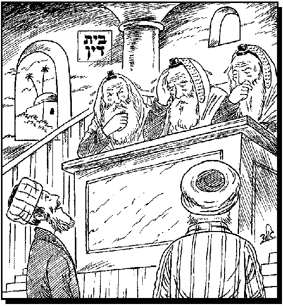 A Jewish Court of Law is quite different from any other. The courts most of us are familiar with have one judge and sometimes a jury of twelve ordinary people who decide if a person is guilty or not. In the Jewish Court of Law there are at least three judges. All are learned in Torah law. Still, the Men of the Great Assembly thought it was important to say: "Be careful when judging. Take your time. Do not rush toward a decision." As you can see from the picture, the two men standing before the judges, are receiving their full attention. The sweat and creased foreheads show how much they are concentrating so they can judge correctly.