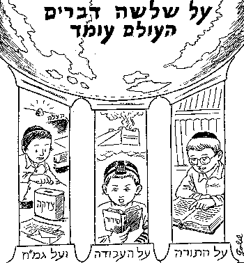 Shimon Hatzaddik (the Righteous one) was the last of the Men of the Great Assembly. "The world is based on three things: the study of Torah, serving Hashem though sacrifices, and prayer (during the time of the Temple) prayer alone (in our days), and acting with kindliness." "Gemilus Chasadim" or acts of kindness include charity as we see in the third picture. It also includes visiting the sick, burying the dead, and many other ways of helping others.