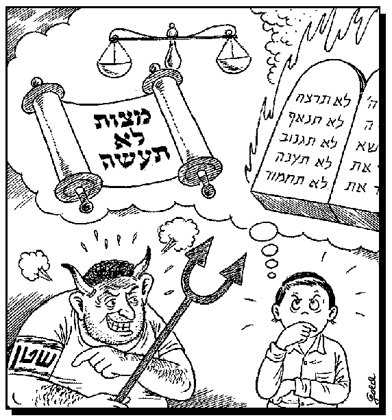 Antignos goes on to say, "Even though you serve Hashem because you love Him, you must also serve Him with fear." If a person loves Hashem, he wants to do as much as possible. He keeps all of the mitzvos of the Torah. But fear of Hashem protects a person from doing those things the Torah tells him not to do. This boy is trying to fight the Satan. If we serve Hashem with both love and fear, we can serve Him completely and push the Satan out of the picture.