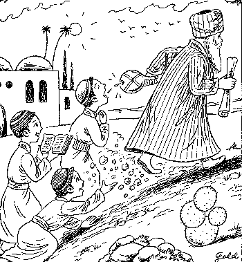 In addition to opening your house to Torah scholars, Yose ben Yoezer and Yosef ben Tzeradak said: "Sit in the dust of their feet and drink their words with thirst." Always follow the scholars. In the picture above the students following their teacher are getting full of dust, meaning that you should follow the lessons of your teacher very carefully. Their mouths are opened and thirsty for the drops of water which their teacher gives them. Water stands for Torah. You should want to hear the words of Torah like a thirsty person wants a drink of water.