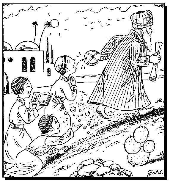 In addition to opening your house to Torah scholars, Yose ben Yoezer and Yosef ben Tzeradak said: "Sit in the dust of their feet and drink their words with thirst." Always follow the scholars. In the picture above the students following their teacher are getting full of dust, meaning that you should follow the lessons of your teacher very carefully. Their mouths are opened and thirsty for the drops of water which their teacher gives them. Water stands for Torah. You should want to hear the words of Torah like a thirsty person wants a drink of water.