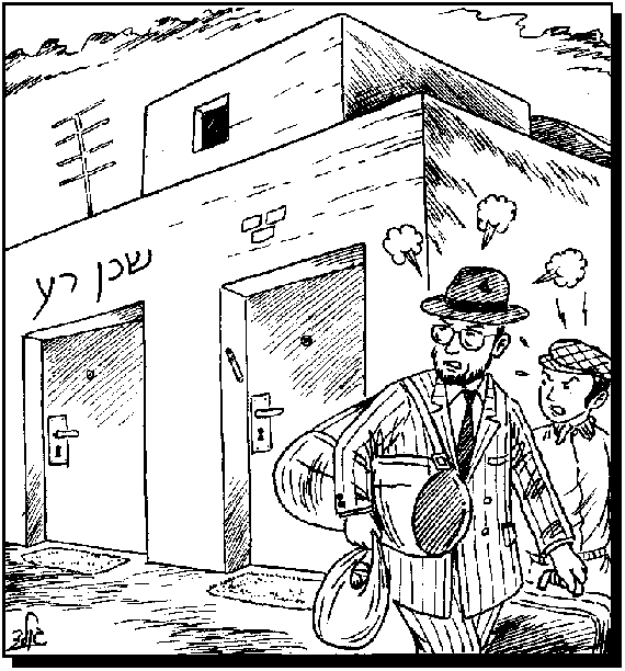 The father and son in the picture have quickly packed up their things and are going far away from their bad neighbor. Just living close to such a neighbor can get them into trouble. How? Either they will learn bad habits from these neighbors and deserve to be punished, or the evil neighbor may hurt the people who live near him. It may also happen that when Hashem punishes the bad neighbor, they may also be hurt, as the Talmud says, "Woe for the wicked one and woe for his neighbor." Stay away.